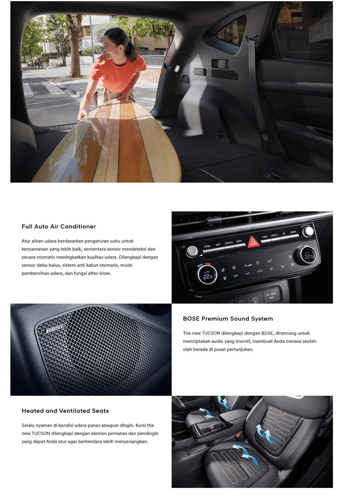 The new TUCSON dengan evolusi desain khas parametric jewel, memberikan sentuhan lebih tegas yang menyatu dengan tampilan sporty. Lebih dari sekedar SUV biasa, The new TUCSON menjadi simbol status dan pencapaian Anda.